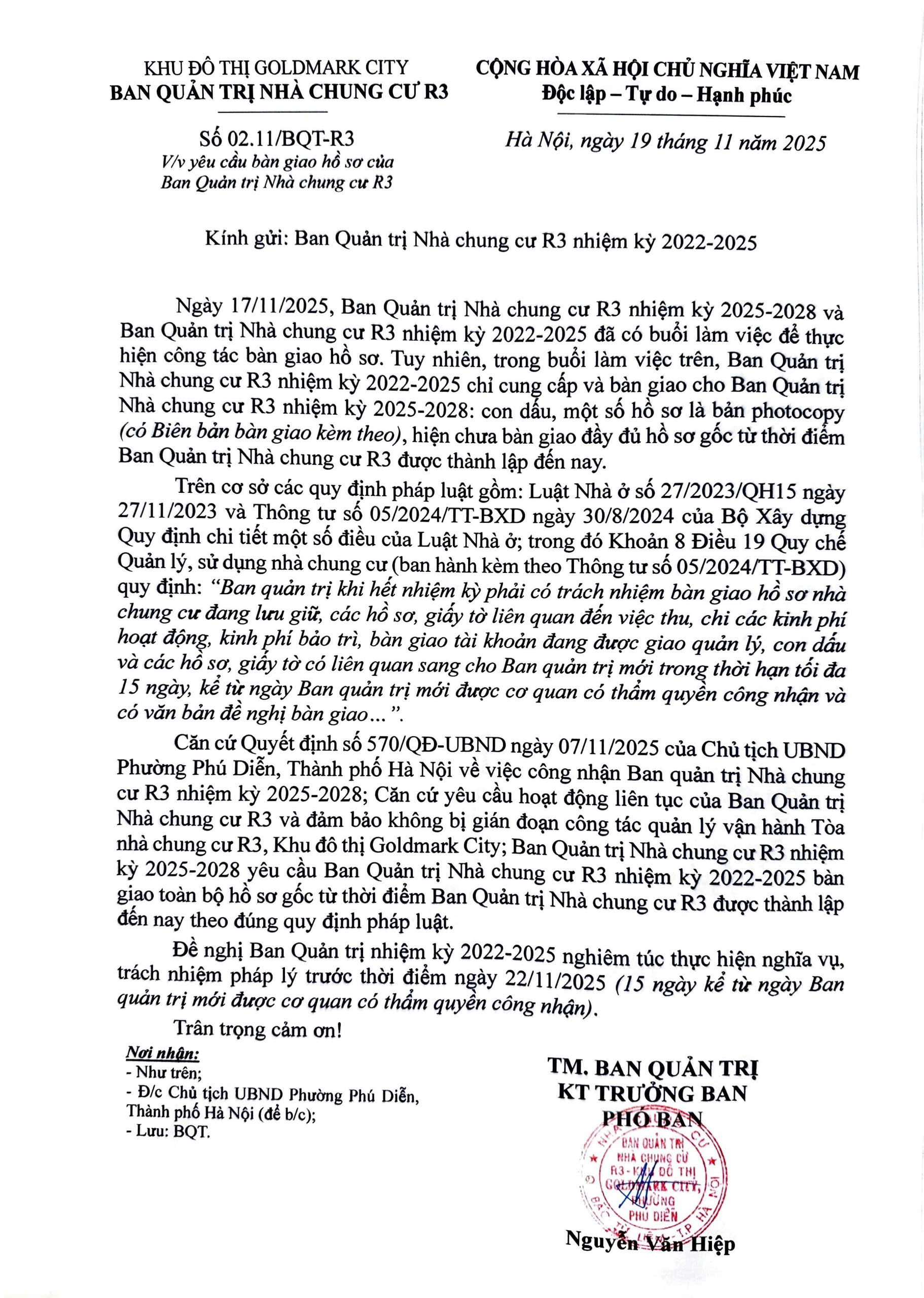 Công văn Số 02.11/BQT-R3 Về việc yêu cầu bàn giao hồ sơ của Ban Quản trị Nhà chung cư R3 nhiệm kỳ 2022-2025 và nhiệm kỳ 2025-2028